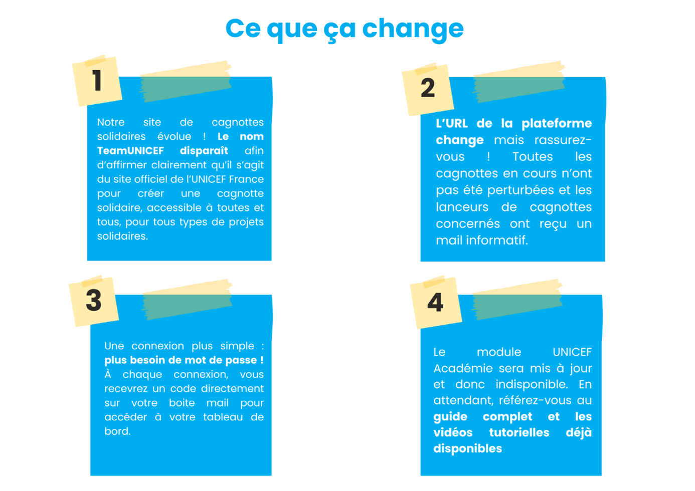 Pour celles et ceux qui étaient habitués à notre ancien site TeamUNICEF, découvrez ci-dessous les principales évolutions.